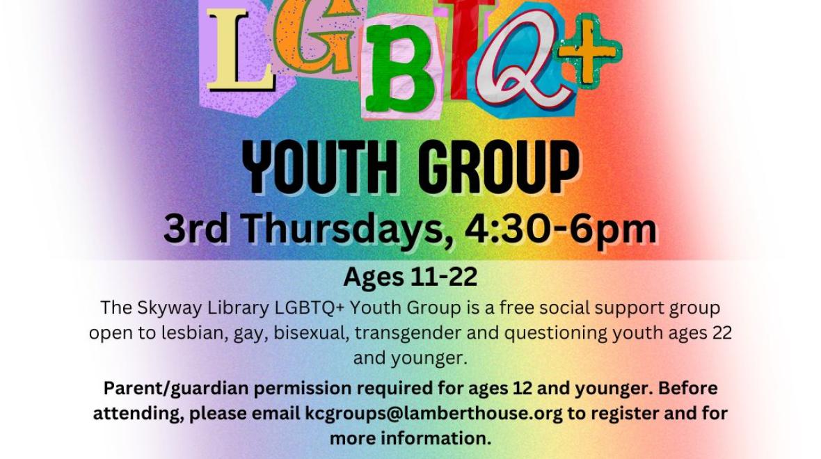Free LGBTQ Youth Group Event Details When No upcoming dates scheduled Price Free Recommended Ages Ages 11-22 years Venue Skyway Library 12601 76th Avenue S Seattle, WA 98178-4835 United StatesGet Directions https://www.lamberthouse.org/