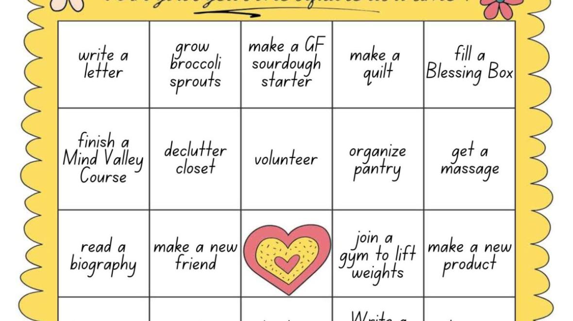 This workshop guides participants through creating a personalized goal "bingo card"—a visual grid of intentions, habits, and small achievable wins. You can focus on personal growth, self-care, career steps, fitness, family routines, or a mix of everything. We’ll provide templates, pens, stickers, and idea prompts to help you fill your squares with realistic, motivating goals. You’ll leave with a completed bingo card ready to tackle 2026! Great for all adults and kids as well!This workshop guides participants through creating a personalized goal "bingo card"—a visual grid of intentions, habits, and small achievable wins. You can focus on personal growth, self-care, career steps, fitness, family routines, or a mix of everything. We’ll provide templates, pens, stickers, and idea prompts to help you fill your squares with realistic, motivating goals. You’ll leave with a completed bingo card ready to tackle 2026! Great for all adults and kids as well!