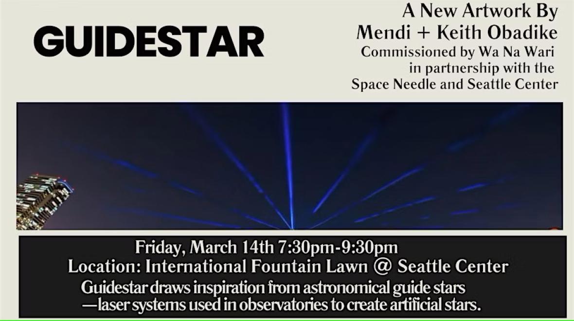 Wa Na Wari is thrilled to announce the debut of “GuideStar” an exciting new art installation at the Space Needle by New York-based artists Mendi + Keith. On Friday, March 14 at 7:30PM over 30 laser beams will shine from the top of the Space Needle for an evening of cosmic exploration and wonder.