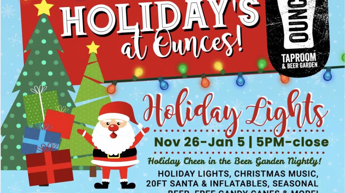 This Holiday Season, experience the magic of the Holidays every night at Ounces with Holiday Lights, Christmas Music, a 20ft Santa, Festive Inflatables & Decor, Holiday Beer & Cider on Tap, FREE Candy Canes and more festive fun for all! Stop in any Tuesday-Sunday from dusk till close to experience the holiday magic!