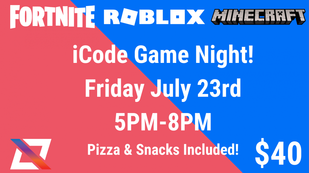 We'll have Minecraft, Fortnite, and Roblox set up on the computers for kids to play together. Cheese pizzas, juice, and snacks will be provided during the event.