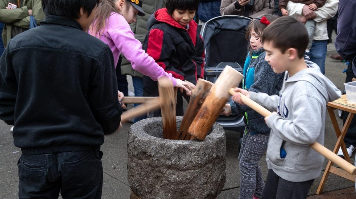 For more than 30 years, the Bainbridge Island Mochi Tsuki celebration has been an important traditional event to bring good fortune in the New Year. Once again, we invite the public to participate in making mochi the traditional way — steaming sweet rice over an open fire, followed by pounding the rice by hand with traditional, handcrafted cherry wood mallets (kine) in a granite bowl (usu). Visitors can get in on the action by trying their hands at pounding the mochi, forming it into cakes by hand, and eating it while it’s still warm and sticky! This event is enjoyed by adults and children alike.