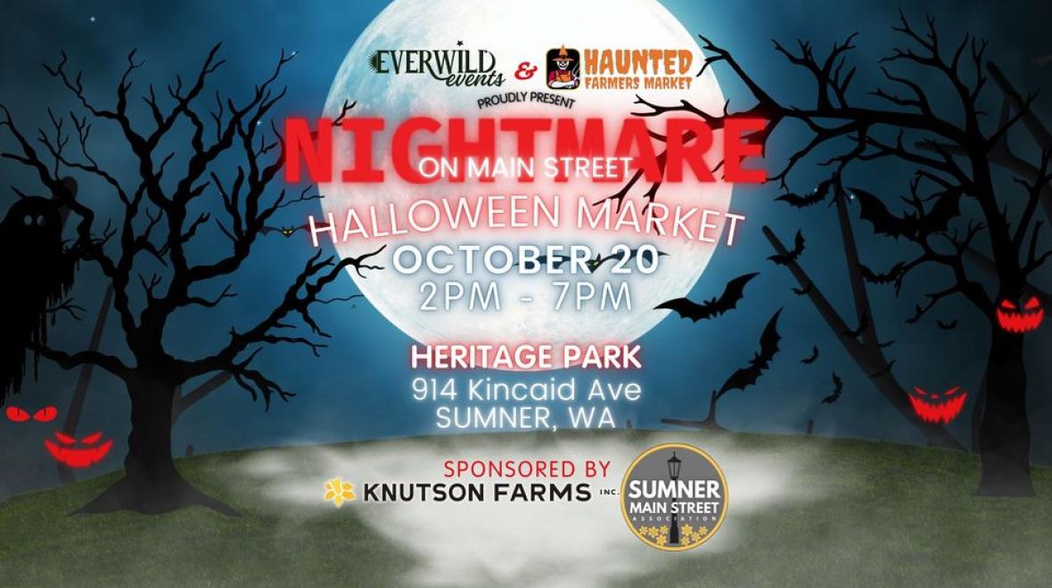Join us in Downtown Sumner for a spooky Halloween market- Nightmare on Main Street presented by Everwild Events and Haunted Farmers Market! Featuring: spooky vendors, food trucks, family activities, pumpkin painting, costumes, trick or treating, face painting and more. Stay late for an outdoor scary movie from 5–7 p.m. Bring a chair and blanket — concessions available.