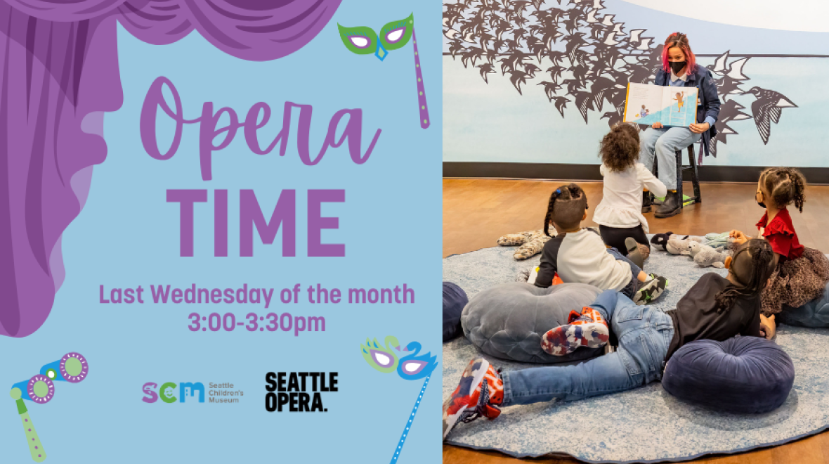 Join Seattle Opera for Opera Time at Seattle Children’s Museum in our Raindrop Reading Room. Immerse yourself in seasonal and topical stories told through song and theatrical performance. Opera Time occurs on the last Wednesday of every month from 3:00-3:30pm through May, courtesy of a partnership with Seattle Opera.