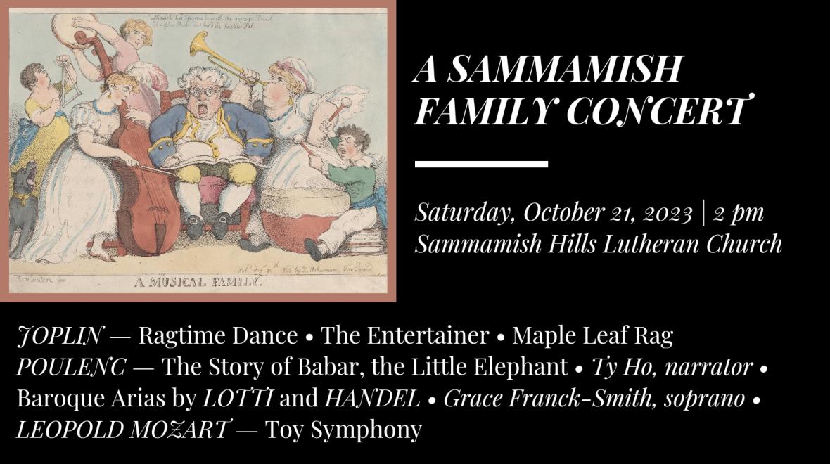 The Sammamish Symphony Orchestra opens its 2023-24 season with a program for music lovers of all ages. The music of Scott Joplin, forever acknowledged as "The King of Ragtime", kicks off the concert with three of his delectable rags, including The Entertainer (made famous by its inclusion in the 1973 film The Sting). Two emerging teenage talents will take solo roles in this concert: soprano Grace Franck-Smith will sing three arias from the Baroque period, and actor Ty Ho will tell The Story of Babar, the Little Elephant as set to music by Francis Poulenc.