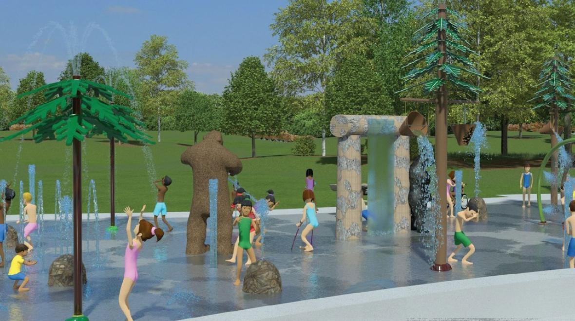 The splash pad features in-ground spray features, as well as many interactive components and features including a large dump bucket, a Sasquatch, a friendly bear and trees.