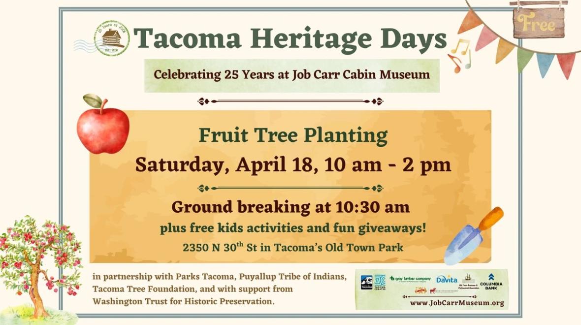 We're celebrating 25 years at Job Carr Cabin with Tacoma Heritage Days. On 4/18, help us plant an orchard in Old Town Park honoring Job Carr's legacy of fruit tree cultivation in Tacoma in partnership with Parks Tacoma, Puyallup Tribe of Indians, Tacoma Tree Foundation, and with support from Washington Trust for Historic Preservation.