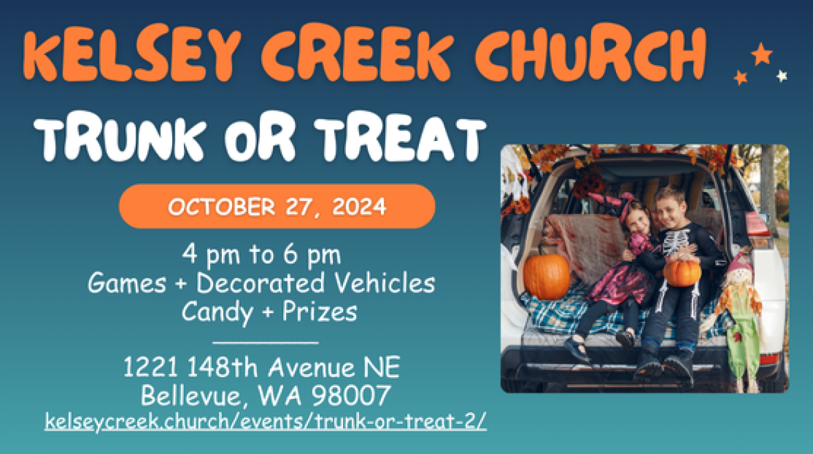 Kelsey Creek Church invites you to participate in this year’s Trunk or Treat event, a fun and safe way for families to enjoy Halloween festivities! We will have decorated vehicle trunks, trick or treating for candy + prizes, games, and treats. It is fun for the whole family.