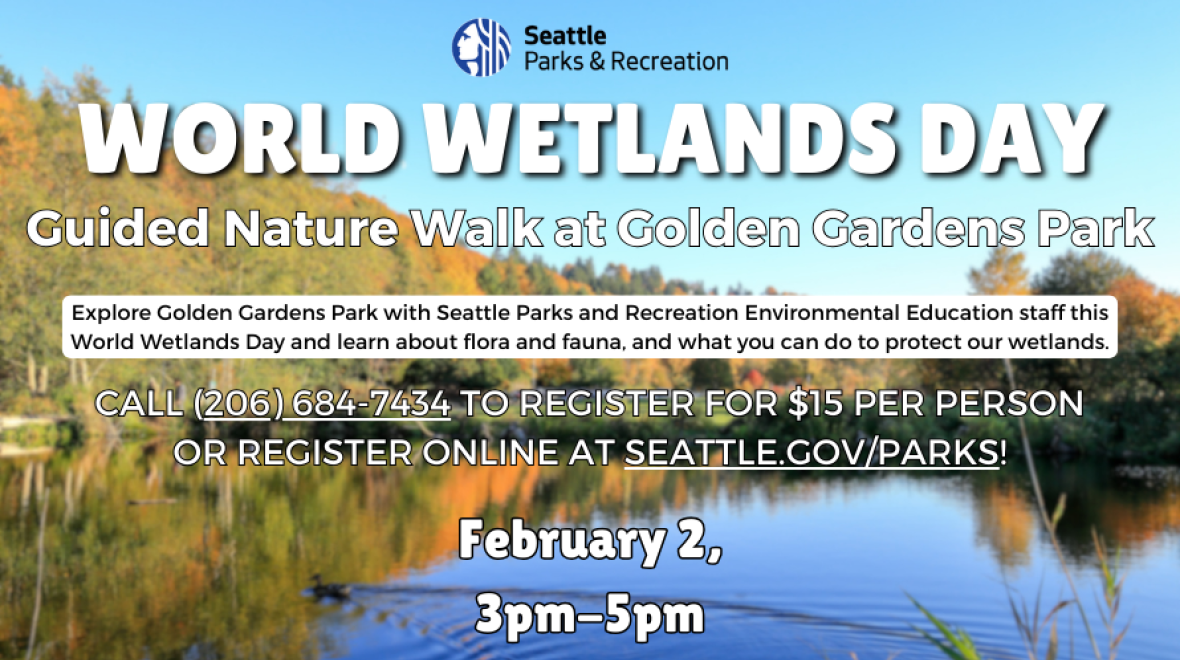 Join Seattle Parks and Recreation Environmental Education staff for World Wetlands Day! Explore Golden Gardens Park wetlands and learn about the flora and fauna, and what you can do to protect our wetlands. No experience or equipment is required for this program, but please bring weather-appropriate gear, and binoculars if you have them.